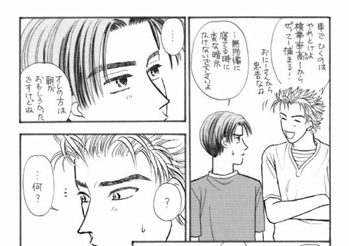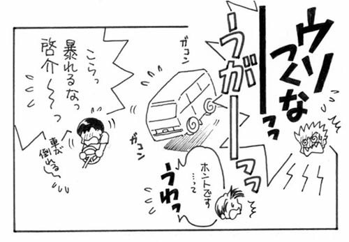 (2004.1.11配布ペーパー) 2004年は年明けから熱かった。 何故なら年明け最初のヤンマガが民宿だったから。 そんなわけで、1月最初のイベントでこのペーパー漫画。 その日出した新刊がたまたま温泉モノで、表紙に浴衣姿のプロDの皆さんを描いたら 「民宿本ですか?!」と言ってくれた方がいたんですが…… いやいや。発売後1週間で、あの大量の漫画描いてオフセット本作るなんて…私には無理っス!(笑) 泊りの時は、「啓介が先に起きる」と後から分って、うそっぱち(超死語)になってしまった漫画ですが。 でもサイトアップしちゃう。