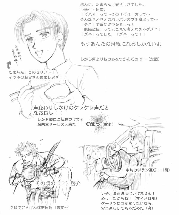 ちっとも描き足りません;;描き足りるということはもはやないのかも。あ、ちなみに、ですが。外伝には啓介出てないんで!妄想なんで!外伝の全然ぐれ慣れてない拓海を見てると、きっとその頃マスター級にぐれていた啓介に思いが飛びます(笑)。